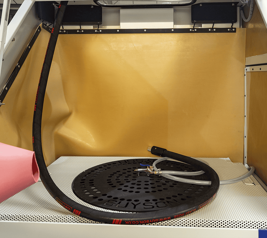 顾森的工业喷砂设备适用于各种砂、丸、砂粒或碳酸氢钠喷砂以及手动喷丸。